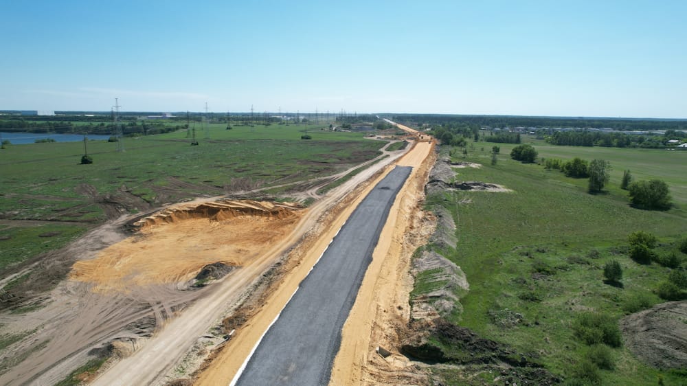 На половине участка строительства дороги от моста до развязки с трассой Липецк – Грязи уже уложен первый слой асфальтобетона. Еще на протяжении почти 1,5 км устроены песчаный и щебеночный слои основания.